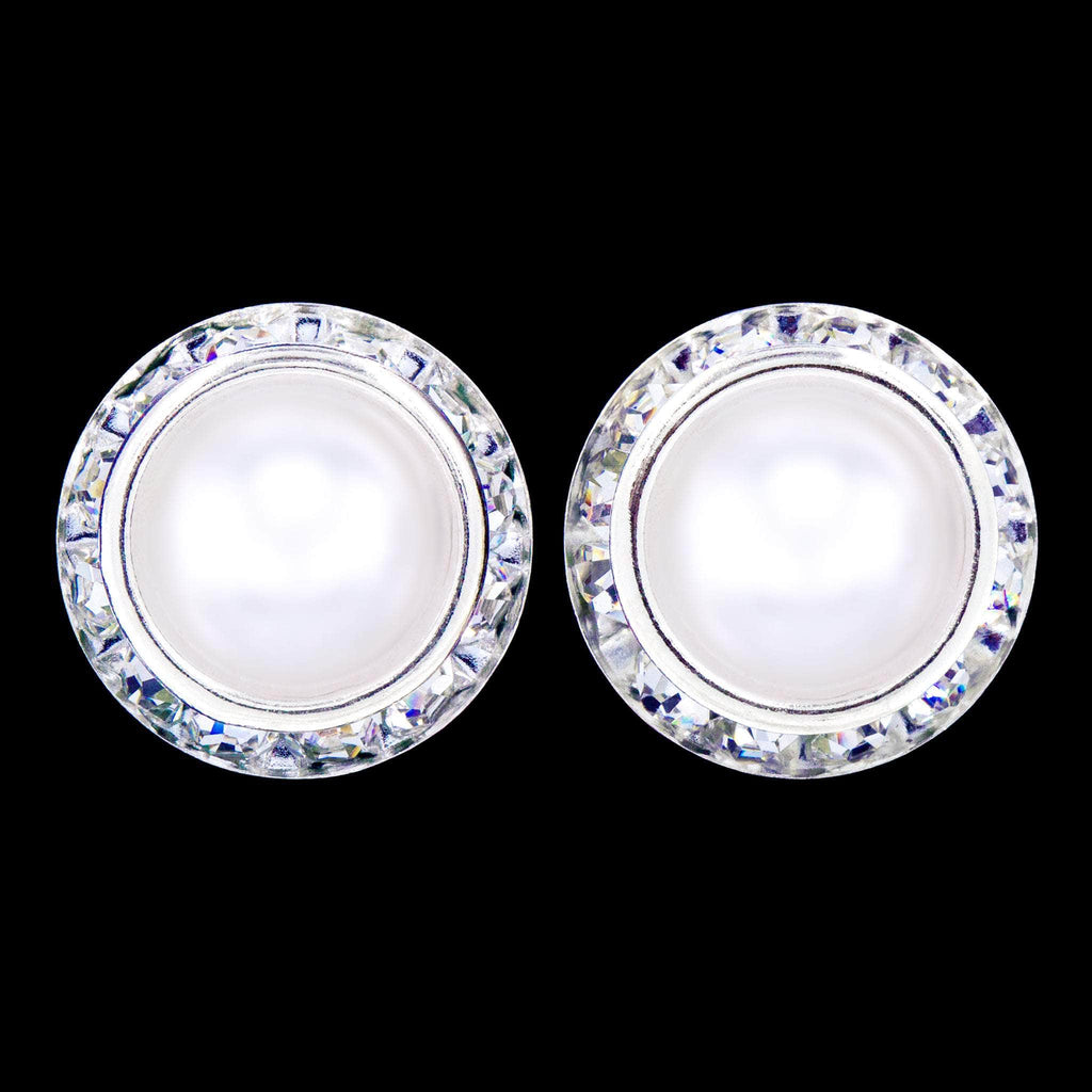 These rhinestone earrings are 20mm (13/16") in diameter. Plated in Sterling Silver. Hypo posts. Each pair is carded and bagged.