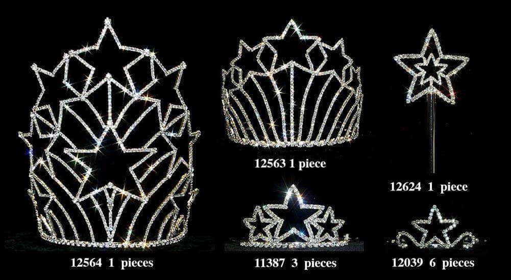 This pageant kit is a great way for a smaller pageant to purchase a group of multiple size tiaras and scepters from the same theme while not needing to conform to the minimums. The style numbers and quantities are listed in the picture of each style included. This is a trial only for a limited time. Sorry, no alterations to this package. Details of each style can be seen on it's own product page.
