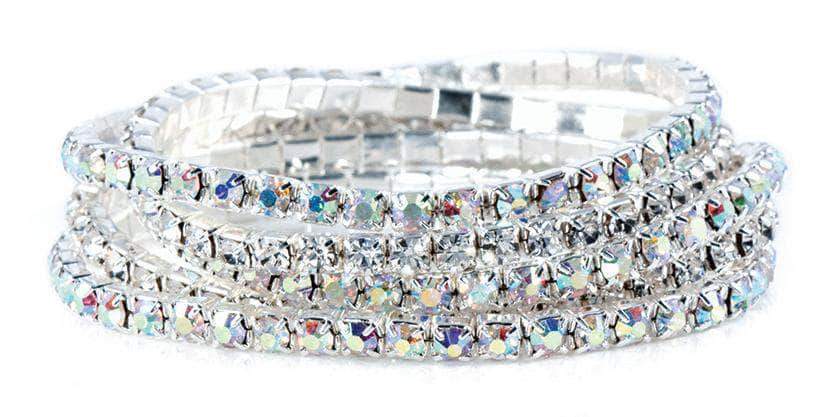 5 color coordinated single row stretch bracelets that can be worn together or worn alone. The 5 bracelets come on a card. Currently in stock. They are silver plated.