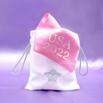 These Sash Bags are wonderful. They have a velvet exterior and satin interior and have a metallic silver pull string. The bags are 6" high x 5" wide when measured flat. They can also fit sashes up to 4" wide. They have an extra inside pocket for storage.